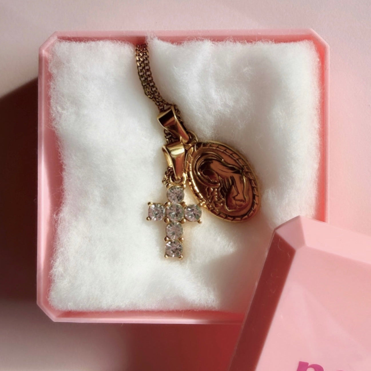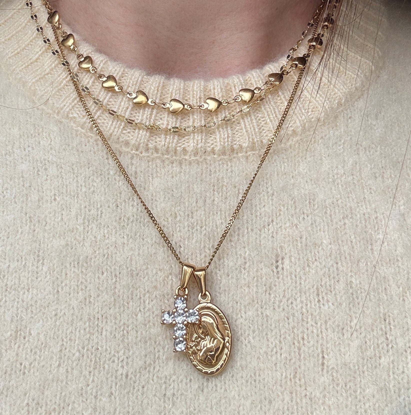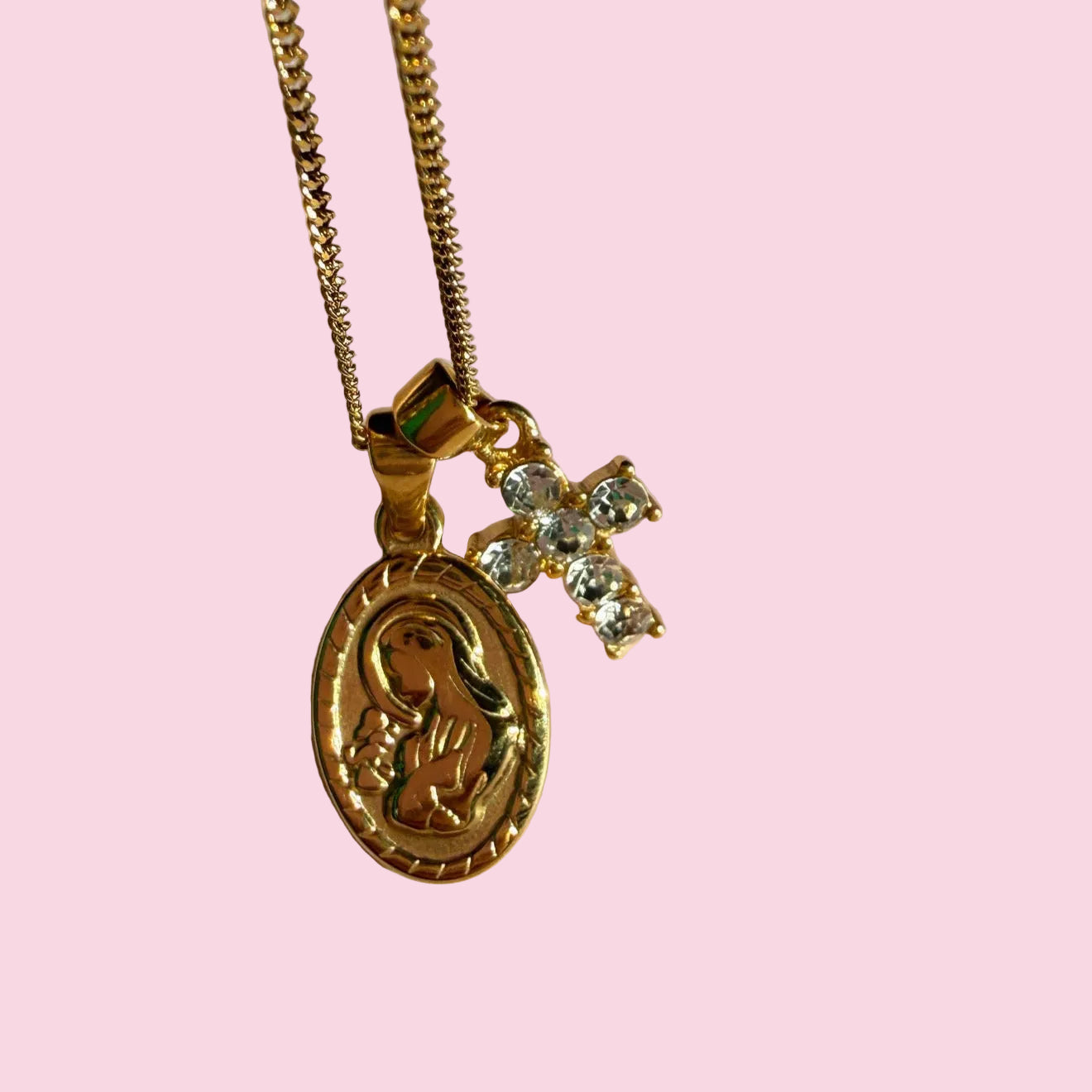 Una sottilissima catena in acciaio inossidabile unita ad un ciondolo croce ed una medaglietta entrambi in acciaio insossidabile placcati oro 18K.